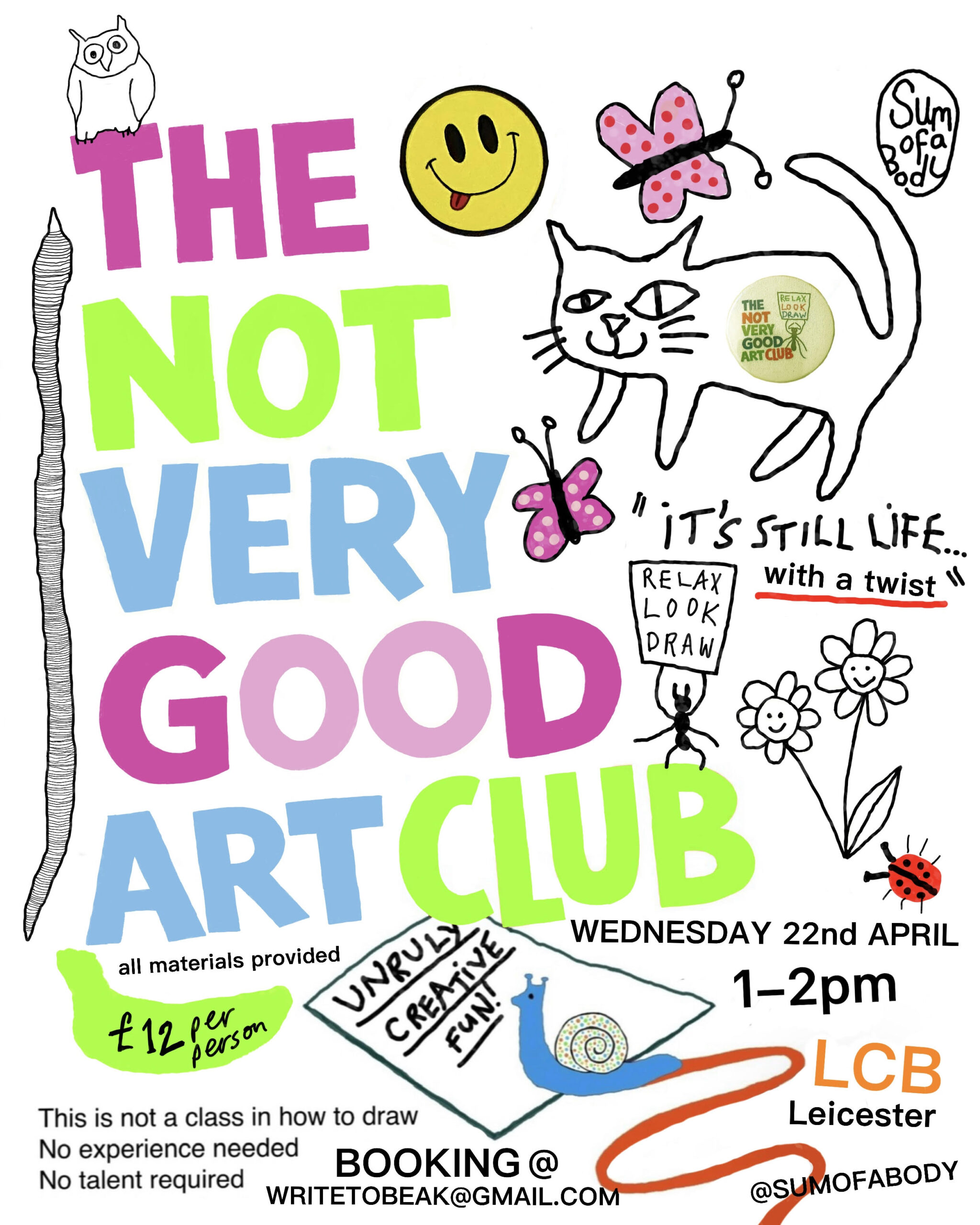 I’m not a teacher and this isn’t a traditional art class. There will be no correcting, no expectation and no pressure. Just unruly creative fun! All materials are provided.